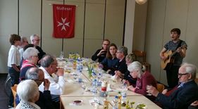 Nach dem Nachtisch, bei dem jeder die Wahl zwischen Milchreis mit roter Grütze oder Quark hatte, gab es musikalische Unterhaltung. Der 21-jährige Tibor Szombati, der bei den Kempener Maltesern derzeit ein Freiwilliges soziales Jahr leistet, sang einige Lieder und begleitete diese mit der Gitarre. Besonders bei dem Titel „Yesterday“, im Original von den Beatles, unterstützte ihn so mancher Teilnehmer des Agapemahls gesanglich. Am Ende des Nachmittages bekamen die Gäste ein kleines Ostergeschenk und wurden durch den Fahrdienst der Malteser wieder sicher nach Hause begleitet.