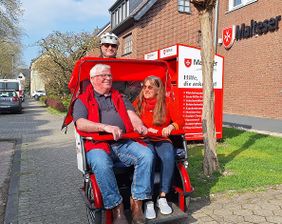 Die Malteser haben ihr Pedelec frühjahrstauglich gemacht und laden nach einem professionellen Sicherheits-Check zur Ausfahrt auf dem roten Dreirad durch die Umgebung ein. Wer die erwachende Natur in der Altstadt oder an sonstigen schönen Flecken am Niederrhein an der frischen Luft genießen will, ruft einfach die Rikscha-Hotline 02152 9590-190 (Di., Mi., Do. 10-14 Uhr) an oder schreibt eine E-Mail an rikscha.kempen@malteser.org. Der ehrenamtliche Service ist kostenlos und kann alleine oder auch zu zweit gebucht werden. Zur Jungfernfahrt 2026 ab Malteserhaus an der Verbindungsstraße 27 hat Longinus Lange Barbara Herrmann-Lange eingeladen auf eine Tour durch die City. Für den frisch geschulten Jürgen Nemetz ist es die erste Ausfahrt als Rikscha-Pilot – die er souverän fest im Sattel meistert. „Gar nicht so einfach, aber es macht riesig Spaß und ist sehr unterhaltsam“, sagt der pensionierte Elektriker. „Weitere Piloten sind herzlich willkommen“, betont Longinus Lange, „zurzeit haben wir acht Fahrer.“ Die Kempener Malteser haben den Service auch deshalb vor einigen Jahren etabliert, um ältere Menschen aus der Isolation zu holen und niederschwellig nette Unterhaltung zu bieten. „Wir kutschieren auch die Seniorinnen und Senioren in den beiden Pflegeheimen“, berichtet Longinus Lange.